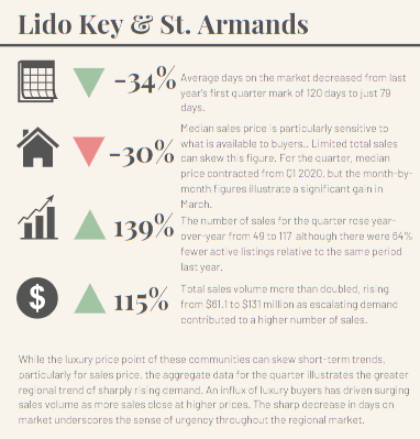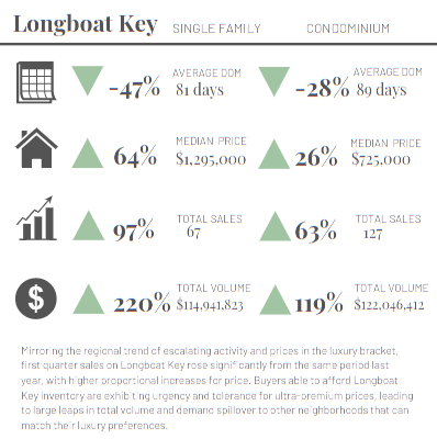 Sarasota’s residential real estate market is extraordinary right now, continuing to exceed projections for price and pace. The first quarter of 2021 saw further escalation in the high demand that is driving prices up as average days on market decline. Nearly all metrics across price category, home type, and neighborhood have risen year-over-year, but the increases in the luxury bracket are most notable. Affluent buyers are rapidly absorbing new construction and existing homes, and sellers of luxury inventory are realizing enormous equity gains even after short holding periods. There has been an even greater influx of out-of-market buyers than our high season usually sees, with the number of prospective buyers exceeding the availability of premium listings.