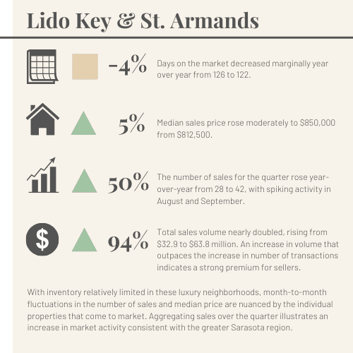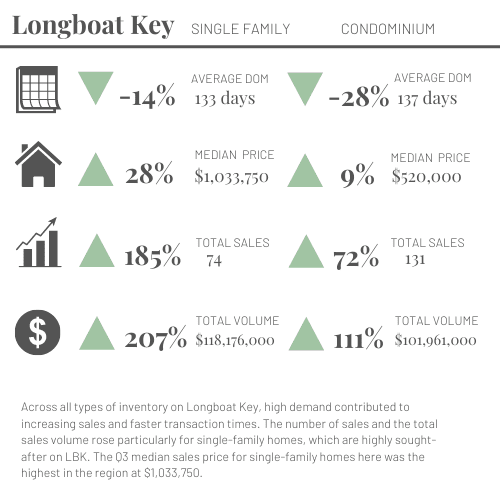Recently ranked by U.S. News & World Report as the nation's top community for retirees, Sarasota's market is benefitting from our natural desirability and escalating demand created by the pandemic. Sales have quickened across every price band while inventory has contracted. The market dynamics continue to offer an advantage to sellers. New development is also transacting rapidly with particular interest in smart home and security features that promote convenience and safety. In the price bracket over $1 million, the year-over-year increase in median sales price and decrease in days on the market exceeded the general market trend, indicating particularly high growth in demand for luxury inventory.