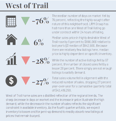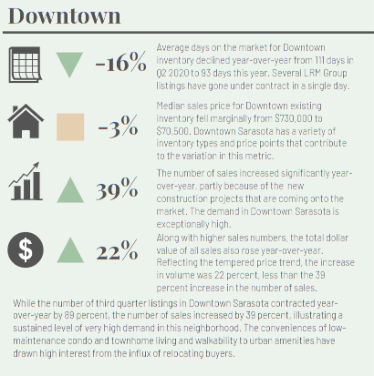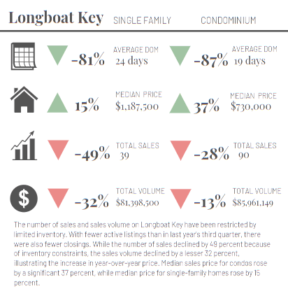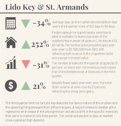 The fever-pitch of market activity that we saw in the second and third quarters is starting to even out a little bit. Demand has not fallen at all, but the pressure on the market has eased slightly as more listings become available. Our latest market report illustrates the third quarter trends that have driven sales pace and price over the last several months. A pronounced shortage in supply has affected market values in every Sarasota community, but has also suppressed the number of transactions that have happened relative to prior years.