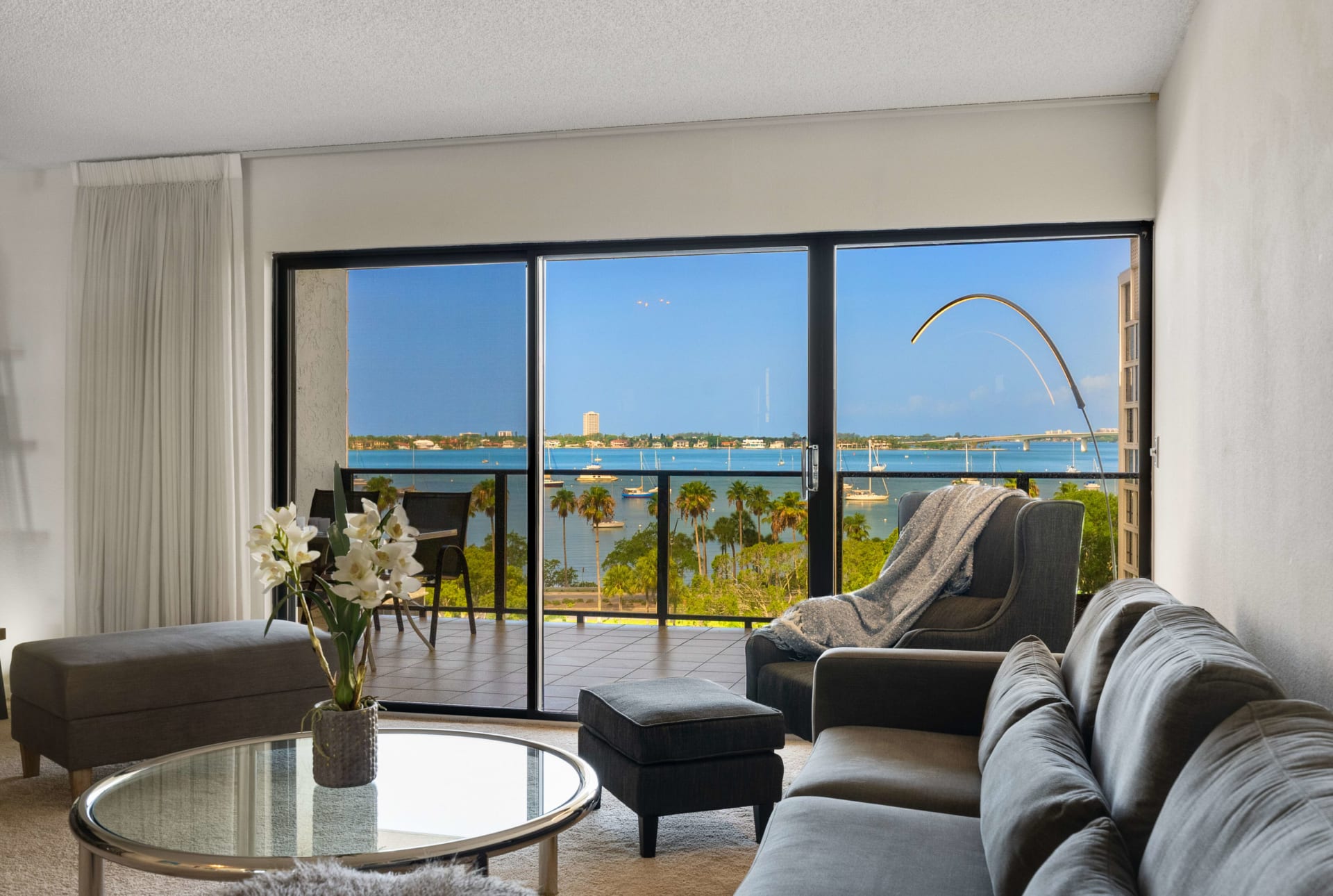 This Palm Place condo is perfectly located to enjoy Downtown amenities, the Sarasota waterfront, and nearby Selby Gardens. The address on Palm Avenue, one of Sarasota's most picturesque streets, is a quiet haven that is steps from popular activities with stunning views of the water and Ringling Bridge. Two bedrooms and a spacious layout in addition to a massive deep terrace create incredible value here. The through-floor layout ensures beautiful vistas of the water and city skyline as well as a cross breeze for indoor-outdoor living enjoyment.