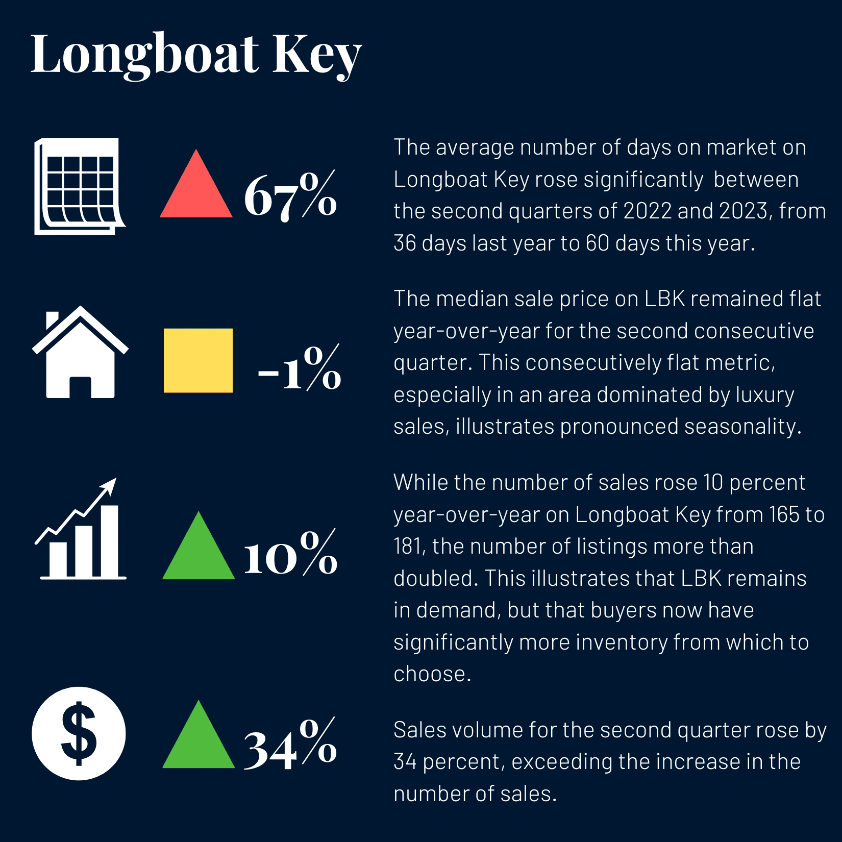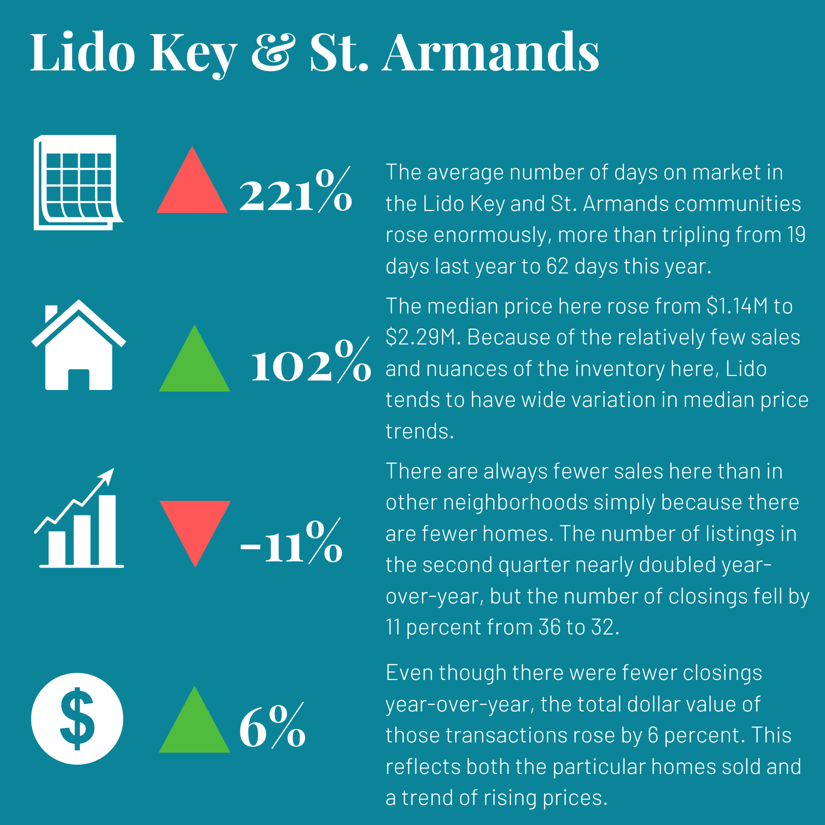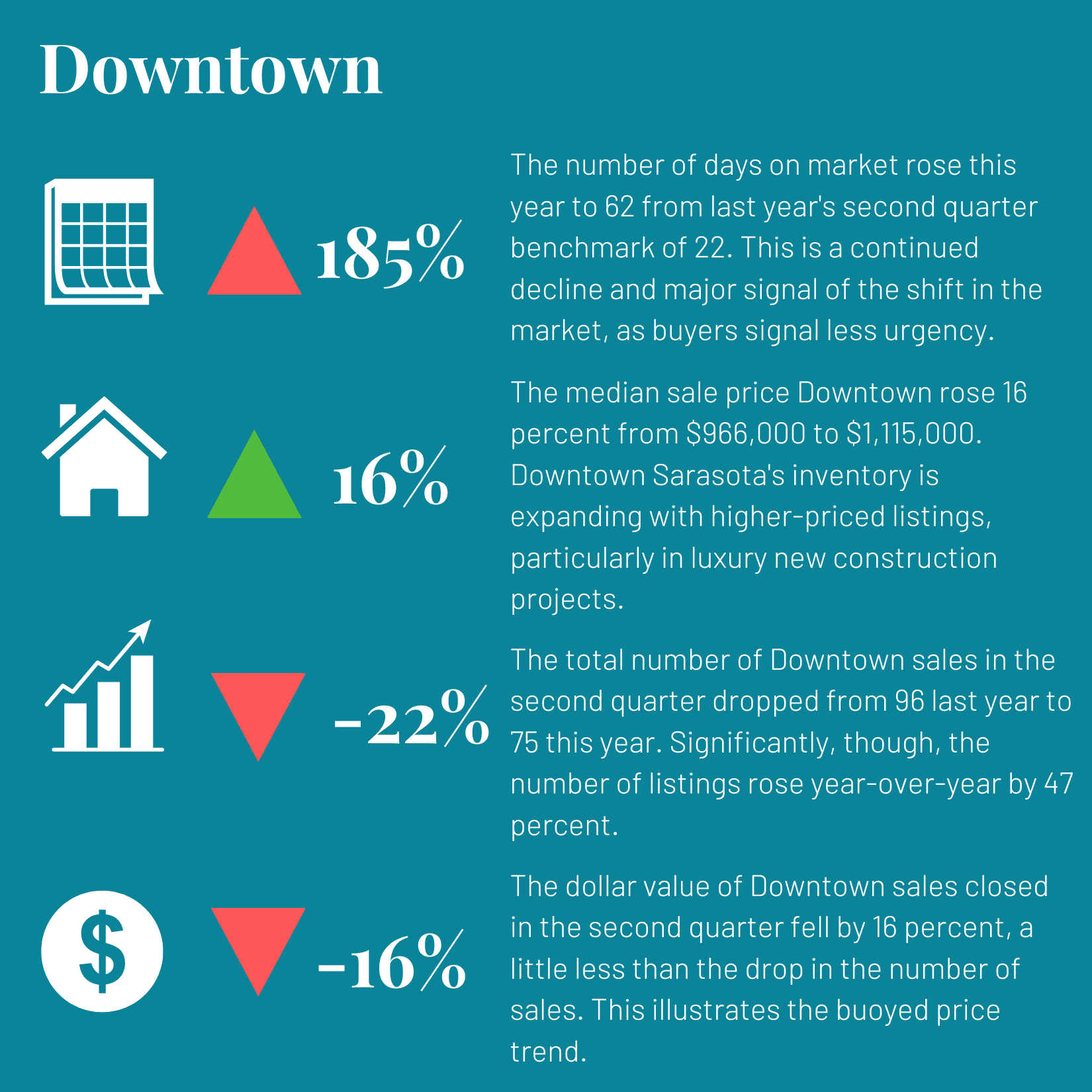 Second quarter trends points to the return of seasonal fluctuation in sales activity and a big change in how quickly (or slowly) homes are selling during these summer months. While pace has downshifted, Sarasota's continued growth and popularity for relocation are sustaining long-term increases in price and market value. Our neighborhood snapshots detail the performance on Longboat Key and Lido Key and in the West of Trail area and Downtown Sarasota. One thing to note is that Sarasota's inventory is increasingly upscale, particularly Downtown where there are more and more luxury condominiums taking shape.